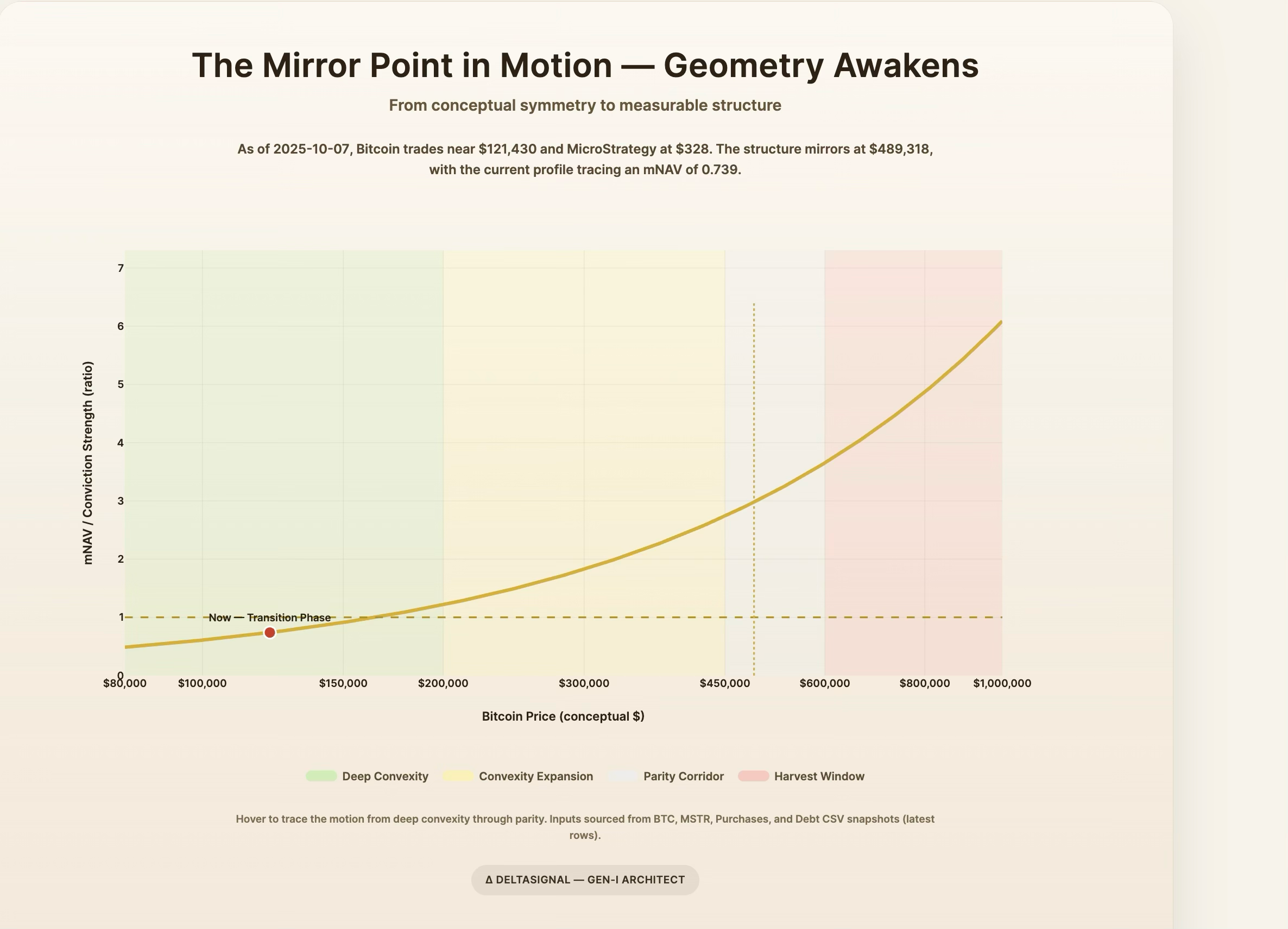 👉 The Mirror Point Curve marks the equilibrium where belief equals math. Beyond it, strength turns into fragility.